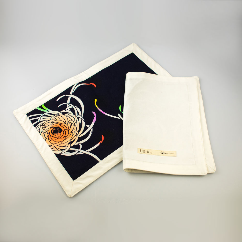 Individual reversible en brim de algodón blanco crudo y tela estampada recuperada.